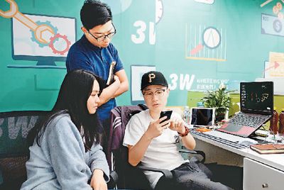 自媒体团队成员正在工位上讨论即将要推出的新一期自媒体视频。