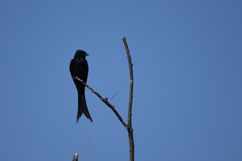 发冠卷尾是雀形目卷尾科卷尾属中型鸟类,体长约28-35厘米。通体绒黑色缀蓝绿色金属光泽,额部具发丝状羽冠,外侧尾羽末端向上卷曲。栖息于海拔1500米以下的低山丘陵和山脚沟谷地带,偶现河滩林带中。单独或成对活动,很少成群,主要在树冠层活动和觅食,以各种昆虫为食。鸣声粗犷简短。