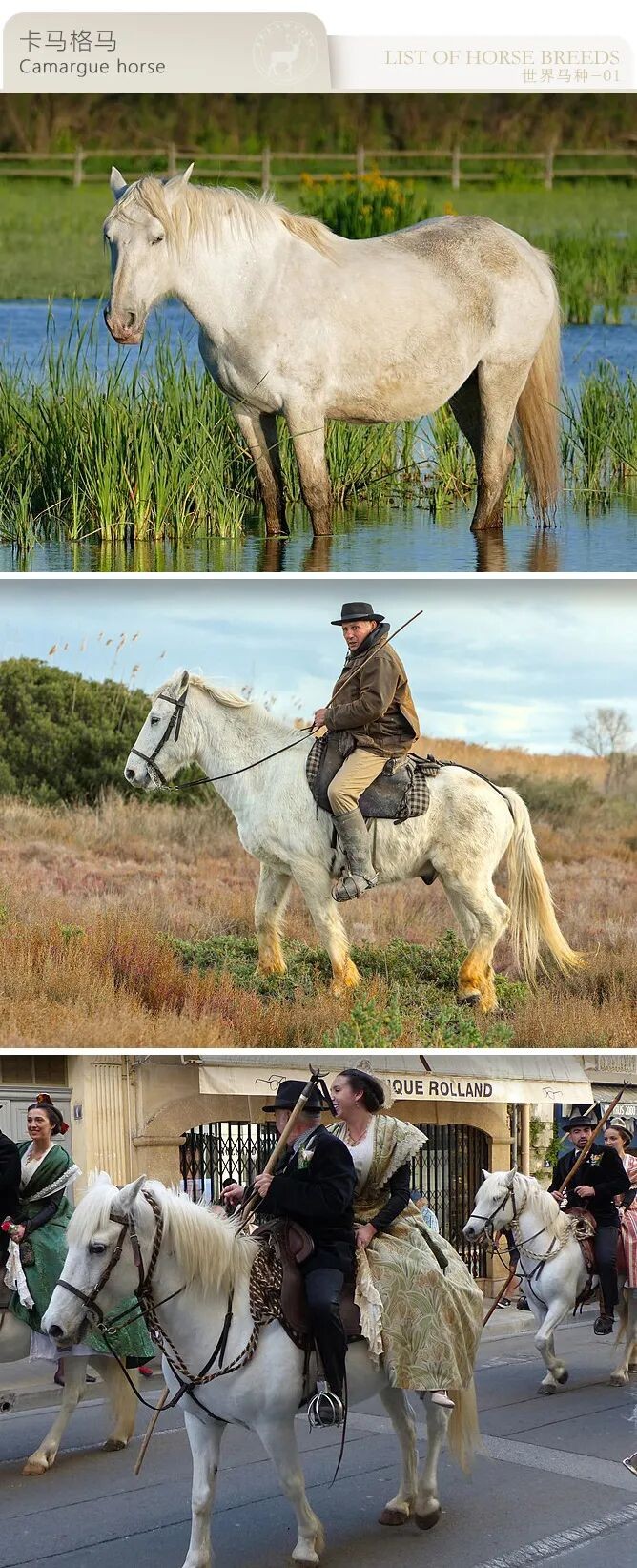 是法国南部的传统工作马品种,原产于卡马格地区。千百年来,这些体型小巧的马匹一直野生在罗讷河三角洲严酷的卡马格沼泽湿地中(地跨加尔省和罗讷河口省),在此孕育出了它们闻名于世的耐力、坚韧性与敏捷度。传统上,它们以半野生状态生活在这片泥泞的土地上。